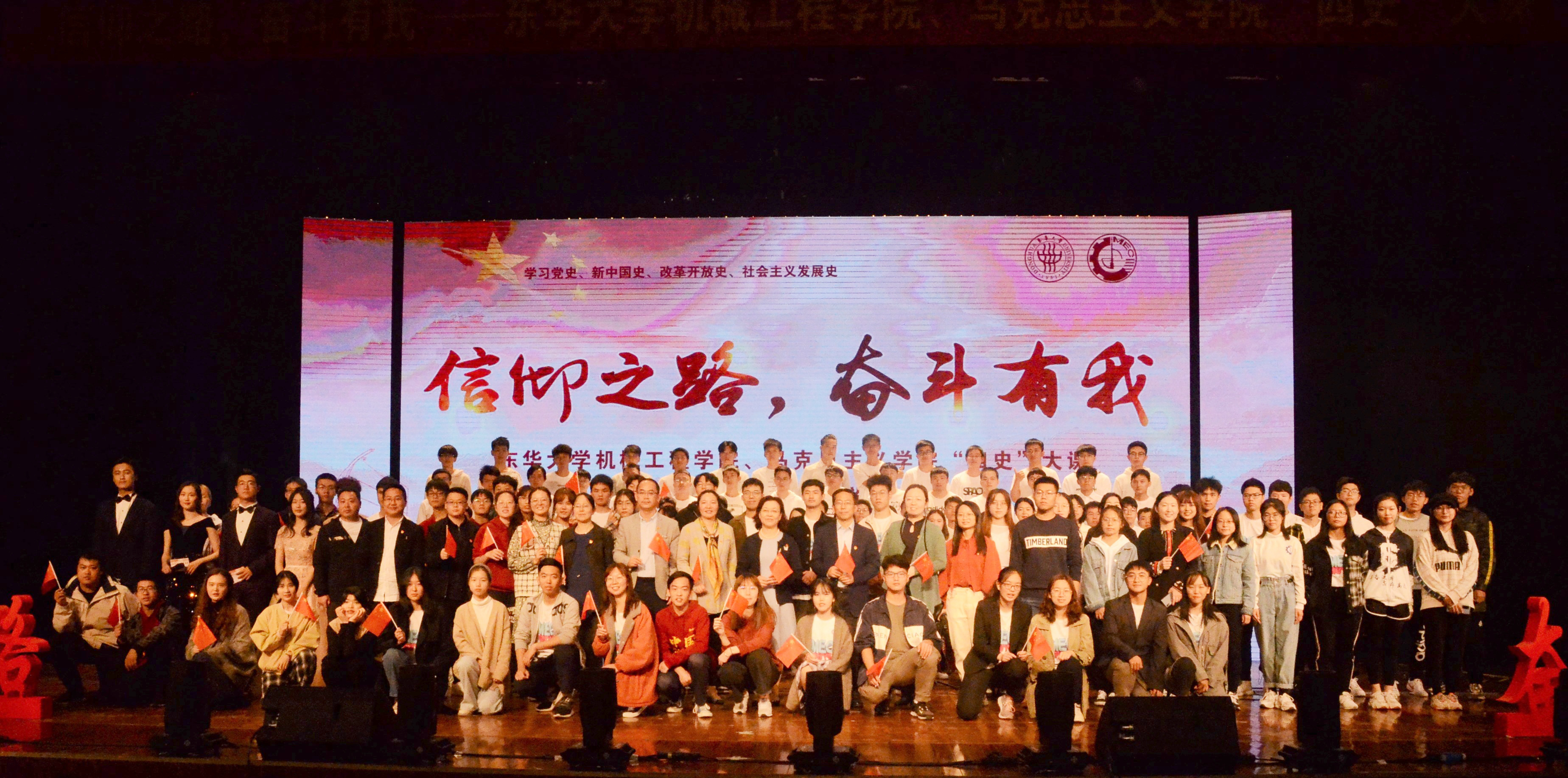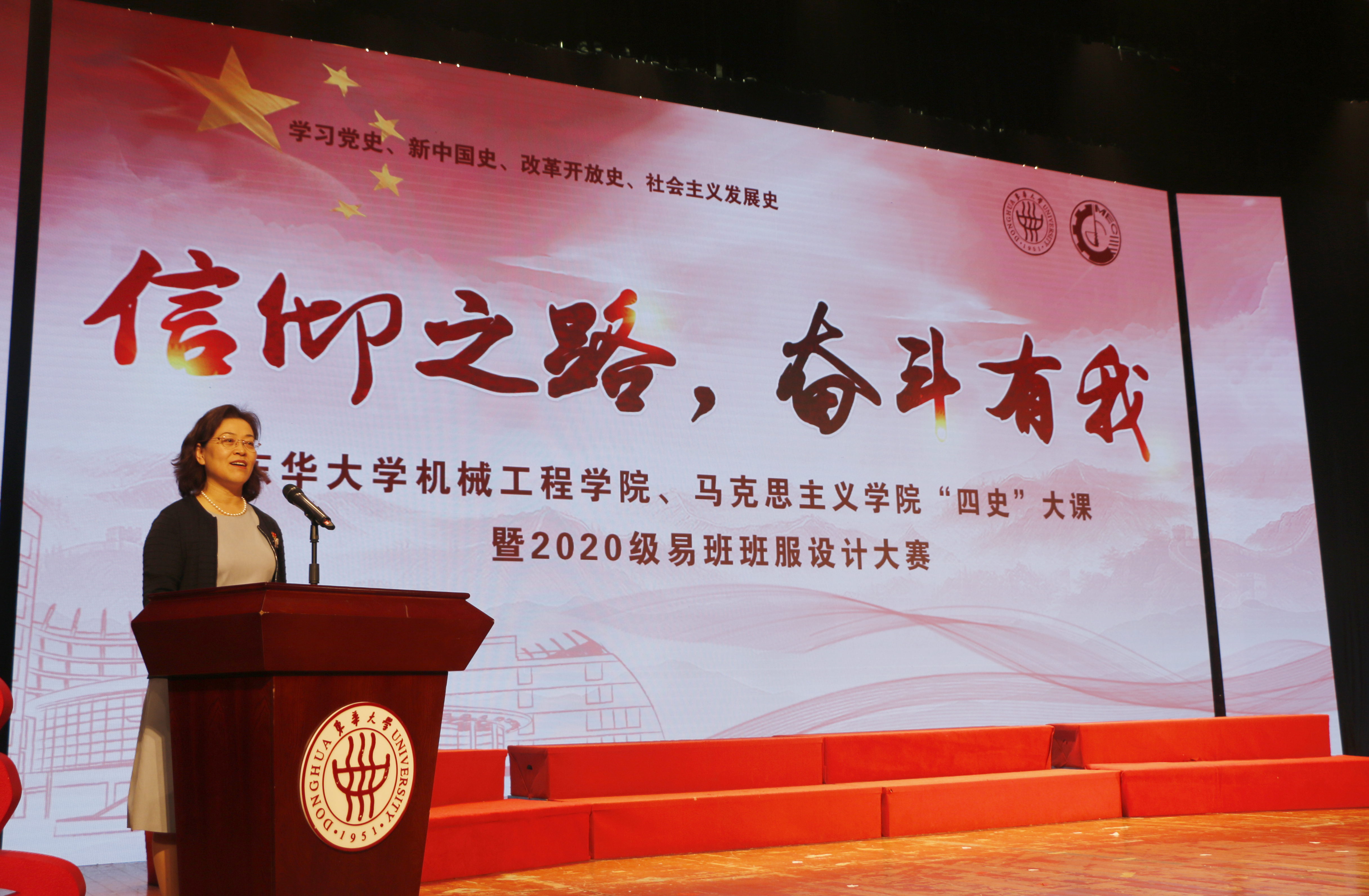 “日月辉映,孕育灿烂人类文明;经天纬地,织就绚丽锦绣中华……”伴随着东华之歌》悠扬旋律,MG冰球突破官网网站、马克思主义学院“信仰之路,奋斗有我——‘四史大课”于113日在松江校区锦绣会堂拉开帷幕。从老一辈华纺人到新一代东华人,穿越时空的记忆,以共同的“东华人”身份,演绎党的辉煌历史在砥砺奋进中续写新的时代华章。校党委副书记崔运花出席大课并致辞,MG冰球突破官网网站党委书记王新厚、马克思主义学院党总支书记戴叶萍、党委组织部副部长、党校副校长徐玥、学生处副处长赵彦明及两学院党员师生、全体20级新生参加大课。