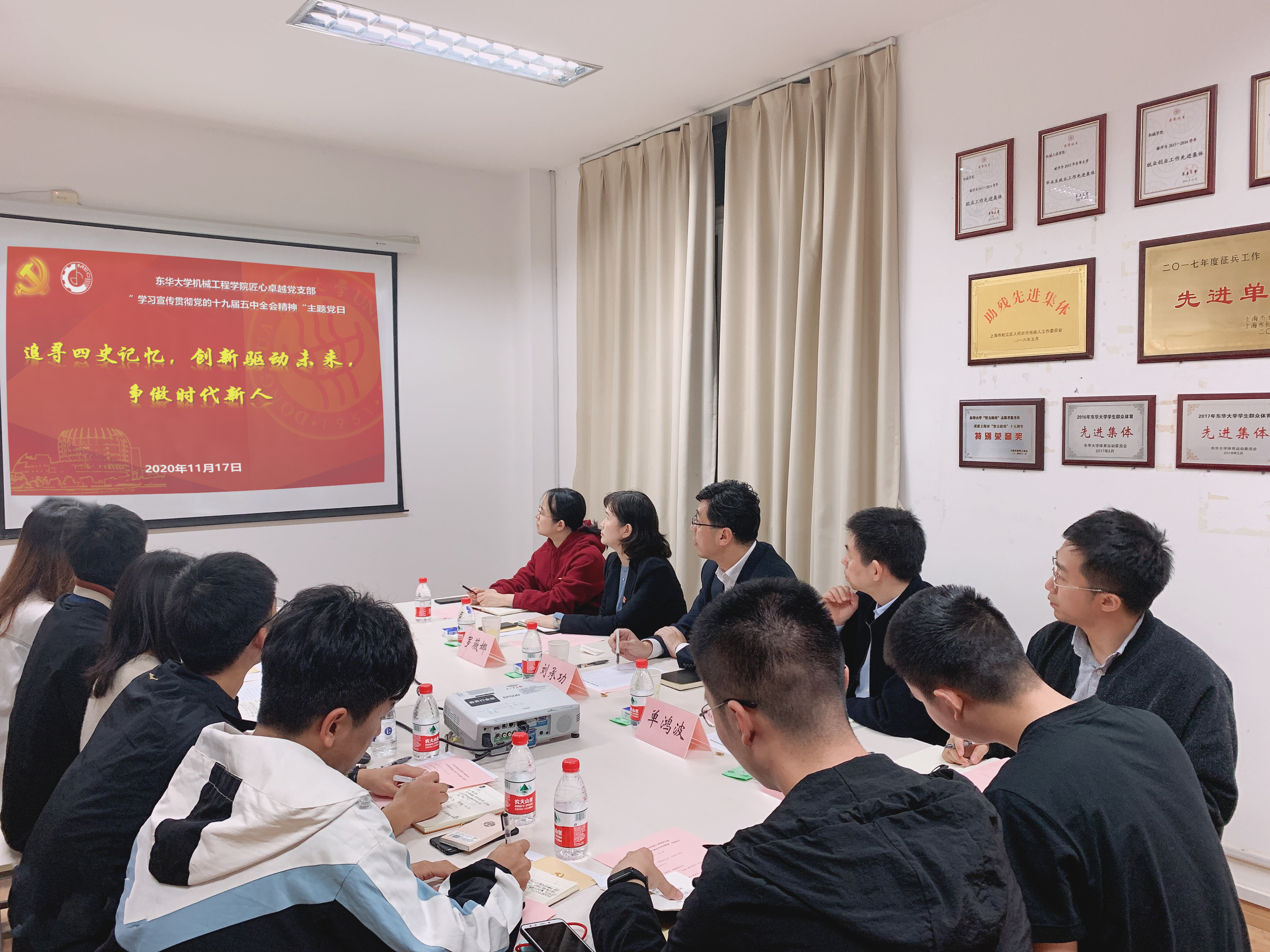 会上,支部书记李陈新讲授以《传承东华精神,迎接建党百年》为题的微党课,通过回顾MG冰球突破官网网站伴随国家发展而不断成长的历程,深入解读东华校训、东华人物与东华精神,引导支部党员在“四史”学习中领会党的十九届五中全会精神的重大意义。支部党员郄熙生动讲述了一名进博会新闻中心“小叶子”的悠悠进博情,不仅见证了祖国高速发展的繁荣昌盛,更读懂了中国青年的责任与担当;支部党员张迅迅结合参与科创竞赛的经历,分享了学习十九届五中全会精神的体会认识。