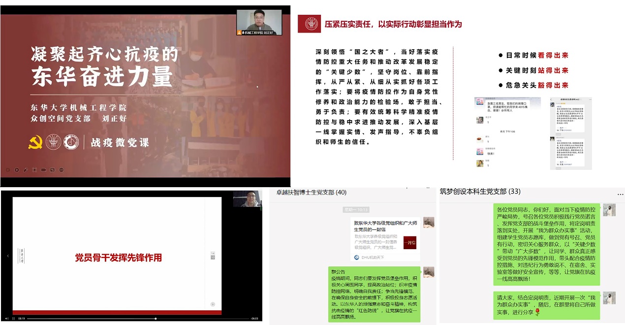 党有号召,党员有行动。MG冰球突破官网网站各党支部、党员在学校党委和学院党委的坚强领导下,以东华人的顽强意志和奋斗精神,冲锋在前践初心,让党旗在抗疫一线高高飘扬。