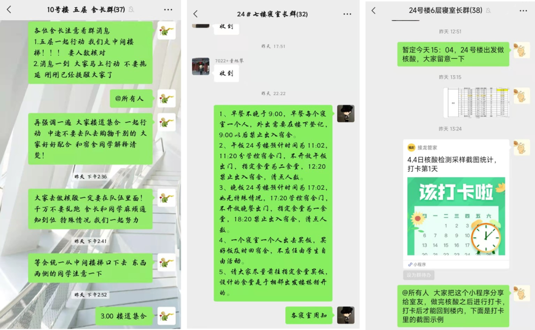 支部全员报名MG冰球突破官网网站学生党员志愿者储备队,以实际行动践行一名共产党员应有的政治品格与政治素养。在全校组织的核酸检测中,支部党员袁权静梓、武晓蒸、马采青等主动多次认领志愿服务,累计服务50余小时,协助做好人员登记、扫码检测、维持秩序等工作;在网格化管理中,支部党员齐文利、金宇健、武晓蒸等自觉担任楼层长,不舍昼夜、严谨细致地落实学校疫情防控工作部署,确保每一位学生实现错时错峰有序参加核酸检测,按时保质收集每一份核酸检测截图、抗原检测结果。