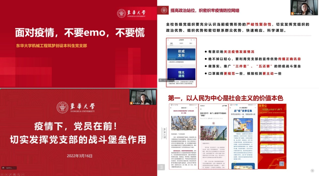 支部围绕《MG冰球突破官网网站疫情防控工作常态化预案》《MG冰球突破官网网站近期疫情防控下学生工作方案》等文件要求,第一时间召开《疫情下,党员在前!切实发挥党支部的战斗堡垒作用》《面对疫情,不要emo,不要慌》《让党旗在防疫一线高高飘扬》主题党日,引导支部党员深刻体认“国之大者”,做到日常时候看得出来、关键时刻站得出来、危急关头豁得出来。