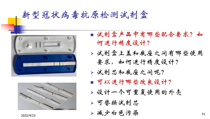 做到知学生所想,应学生所需,谋学生成长,结合课程大纲,带领学生对抗原检测试剂盒的结构进行分析,思考试剂盒“可替换内芯”和“可重复使用外壳”的改良设计方案,教导学生严格遵守学校防疫要求,致敬抗疫一线工作人员的辛勤付出。