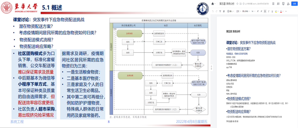 将疫情防控期间的“课程思政”教学理念贯穿整个教案的设计,实现知识传授与价值引领的无缝衔接。在《系统工程》的课堂上,李婕老师以“物资配送”为目标,围绕疫情期间社区和校园物资配送方案选择、应急物资分类以及配送流程和响应策略指导学生展开讨论。
