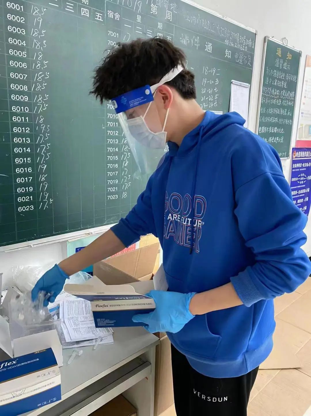 负责把每日三餐、抗原以及其他防疫物资从一楼搬到六楼并逐个宿舍发放,同时监督并催促每个宿舍及时进行核酸和抗原检测的结果打卡,经过一个多月的防疫志愿工作,他深刻地体会到了防疫工作人员的不容易,每个人都在默默地付出着,为了早日结束疫情做出着贡献,他说要向众多志愿者学习,学习他们不怕苦不怕累的精神,以饱满的姿态继续为大家服务。