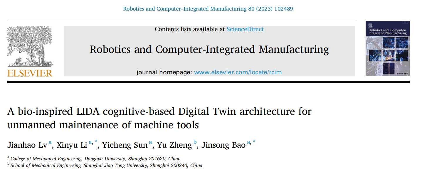 近日,我校MG冰球突破官网网站智能制造团队在数字孪生认知智能制造方面取得新进展,这一成果以“A bio-inspired LIDA cognitive-based Digital Twin architecture for unmanned maintenance of machine tools(一种用于无人机床维护的LIDA认知仿生数字孪生架构)”为题发表于国际制造知名学术期刊《ROBOTICS AND COMPUTER-INTEGRATED MANUFACTURING》(中科院一区,影响因子10.103)。论文以MG冰球突破官网网站为第一单位,李心雨特聘研究员和鲍劲松教授为共同通讯作者,所指导的吕健豪博士生为第一作者。