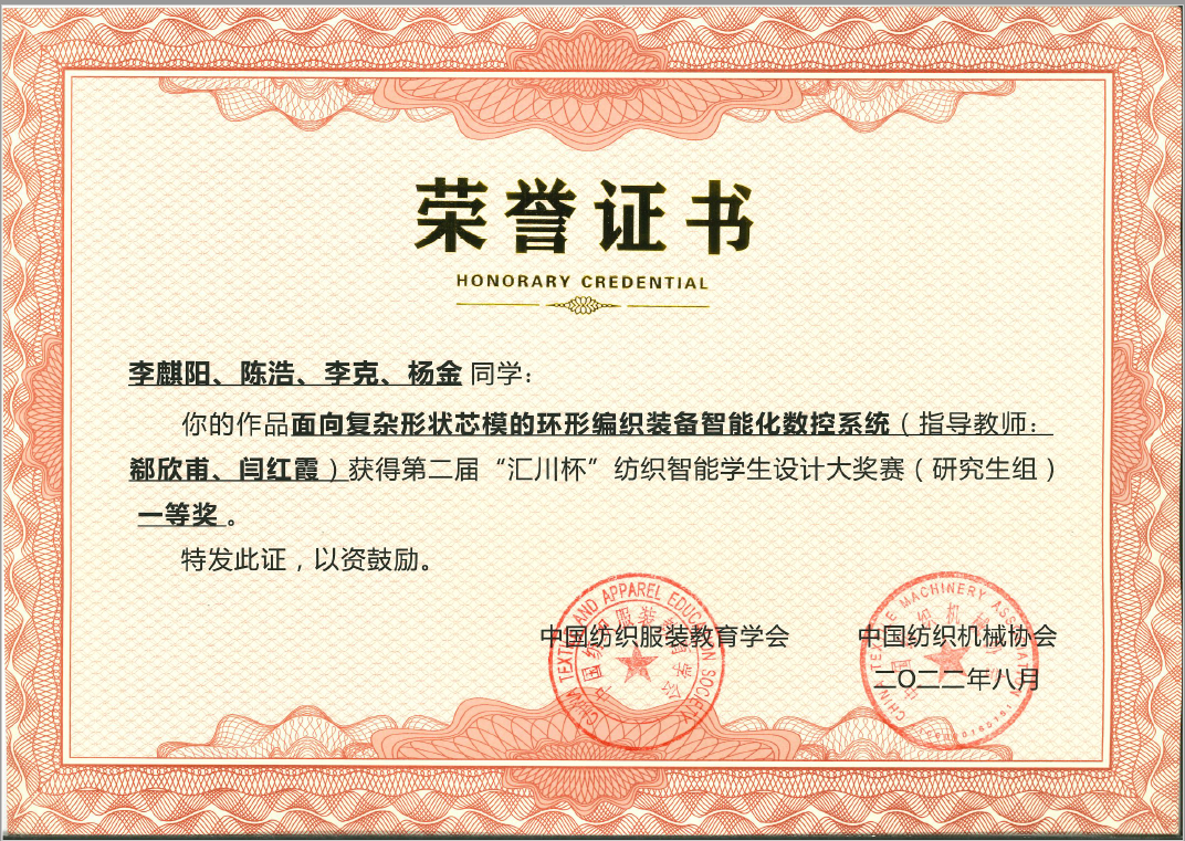近日,第二届“汇川杯”纺织智能学生设计大奖赛获奖名单公布。经过专家评审和现场答辩,MG冰球官网研究生李麒阳、陈浩、李克和杨金完成的团队作品《面向复杂形状芯模的环形编织装备智能化数控系统》(指导教师:郗欣甫、闫红霞)荣获总决赛(研究生组)一等奖。