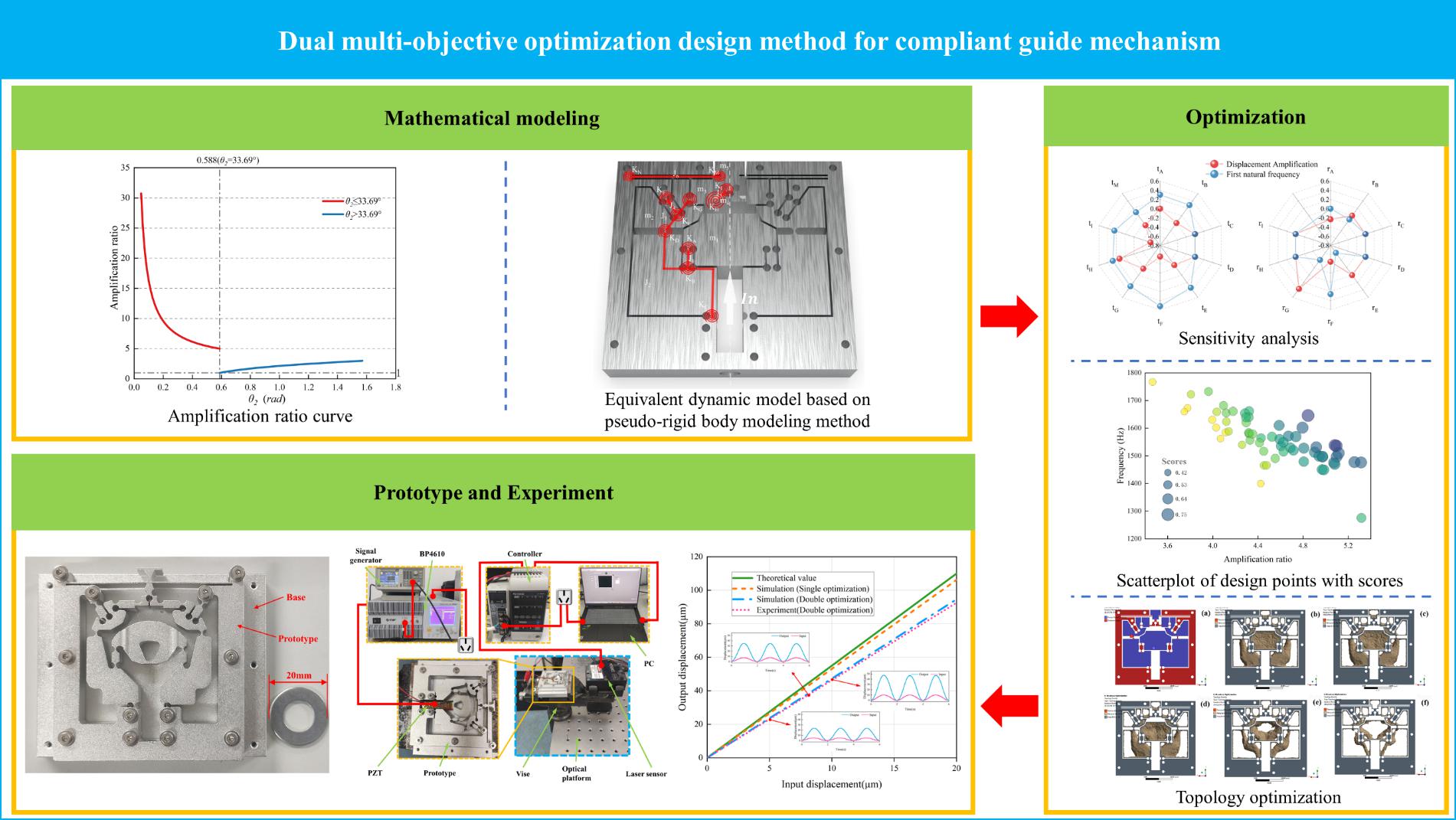 柔顺机构具有精度高、重量轻、易加工、无摩擦、无需润滑等特点,通过弹性构件的挠曲变形实现微纳米位移的精准传递,在超精密作业中扮演重要角色,目前已在精密光学、细胞操纵、可控核聚变、太空探测等高精尖领域得到应用。课题组团队通过构建柔顺机构优化设计新方法,提出了双重多目标优化设计流程,并以“Dual multi-objective optimization design method for compliant guide mechanism”为题发表于国际期刊Structural and Multidisciplinary Optimization(IF: 3.9, JCR Q1),MG冰球突破官网网站为唯一通讯作者单位,孙志宏教授为该论文的第一作者,孙小庆副教授为通讯作者。文章链接:https://doi.org/10.1007/s00158-024-03793-z