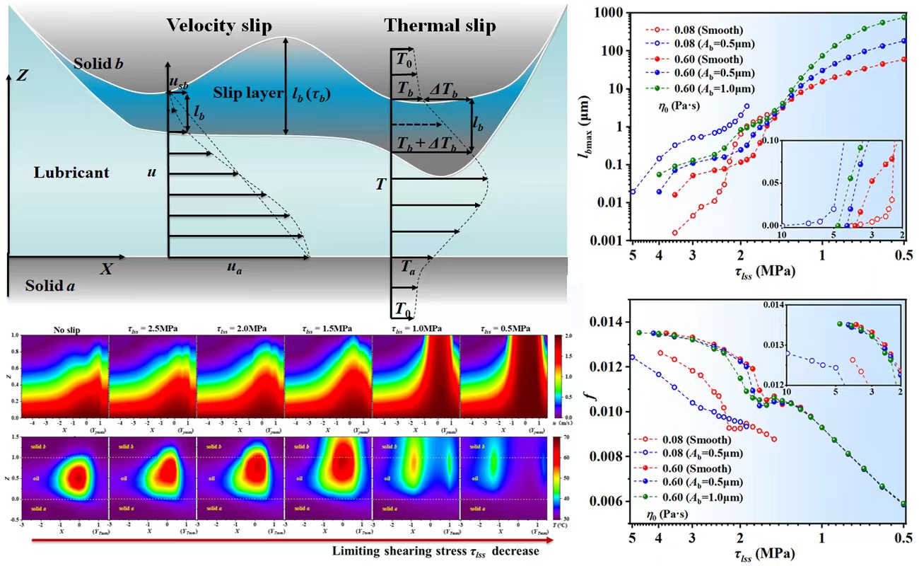超滑(超低摩擦)是摩擦学研究的热点问题,而边界滑移是实现超滑的关键机制之一。王静教授团队将边界滑移理论与传统的热弹流润滑理论结合,建立了考虑速度滑移和温度滑移的线性滑移模型和受临界剪切力影响的非线性界面滑移模型,从理论层面提出了利用边界滑移实现减摩的新方法。在理论的指导下,利用镀膜技术开展弹流条件下钢/油界面滑移实验,实验过程中不仅验证了利用边界滑移实现减摩的可行性,并且创新性地提出了一种利用膜厚变化精确测量弹流条件下固-液界面滑移长度的方法,搭建了滑移长度-油膜厚度-摩擦系数之间的桥梁,迈出了油润滑弹流条件下实现超滑的关键一步。