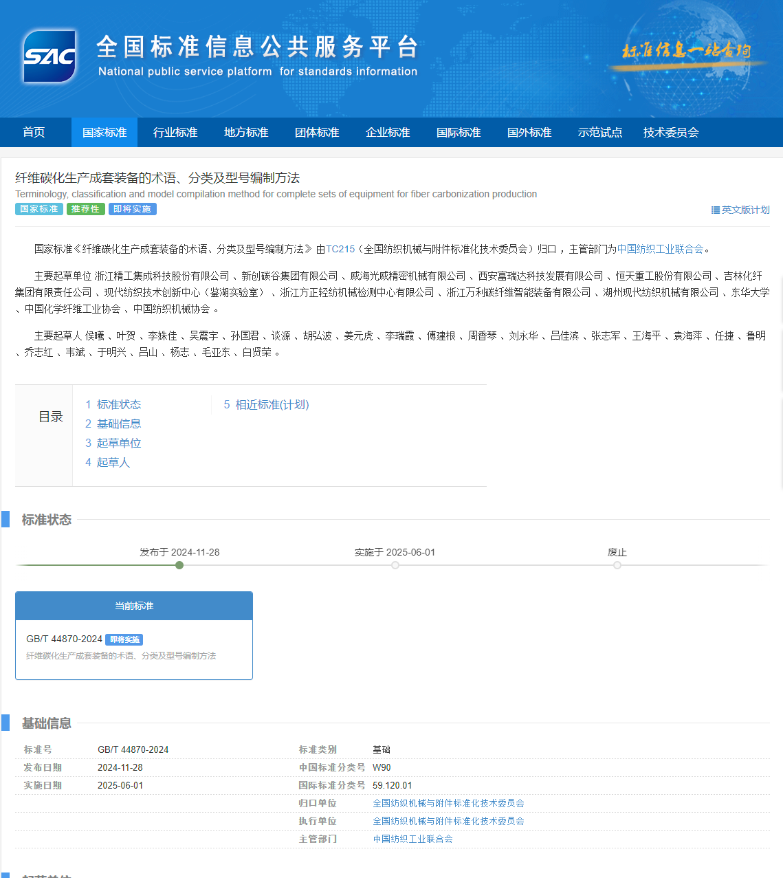 近日,国家市场监督管理总局(国家标准化管理委员会)发布了2024年第29号《中华人民共和国国家标准公告》,由MG冰球官网参与制订的国家标准GB/T 44870-2024《纤维碳化生产成套装备的术语、分类及型号编制方法》正式获批发布。该标准由TC215(全国纺织机械与附件标准化技术委员会)归口 ,主管部门为中国纺织工业联合会,主要起草单位为浙江精工集成科技股份有限公司 、新创碳谷集团有限公司 、威海光威精密机械有限公司 、西安富瑞达科技发展有限公司 、恒天重工股份有限公司 、吉林化纤集团有限责任公司 、现代纺织技术创新中心(鉴湖实验室) 、浙江方正轻纺机械检测中心有限公司 、浙江万利碳纤维智能装备有限公司 、湖州现代纺织机械有限公司 、MG冰球突破官网网站 、中国化学纤维工业协会 、中国纺织机械协会 。纺织装备教育部工程研究中心全程参与此次标准制定,李姝佳老师排名第3。