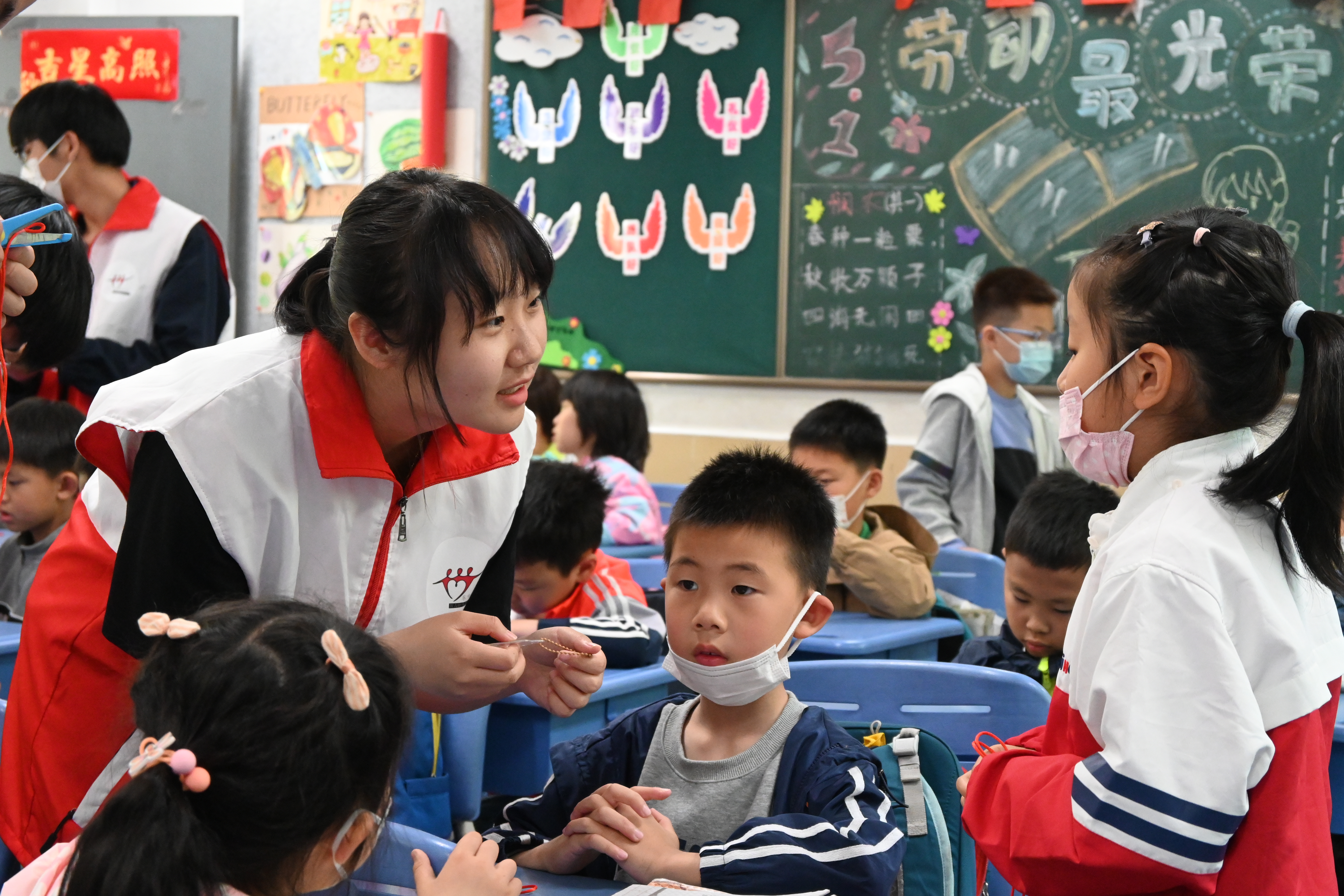 (智力助残志愿者与小学生共同编织中国结)